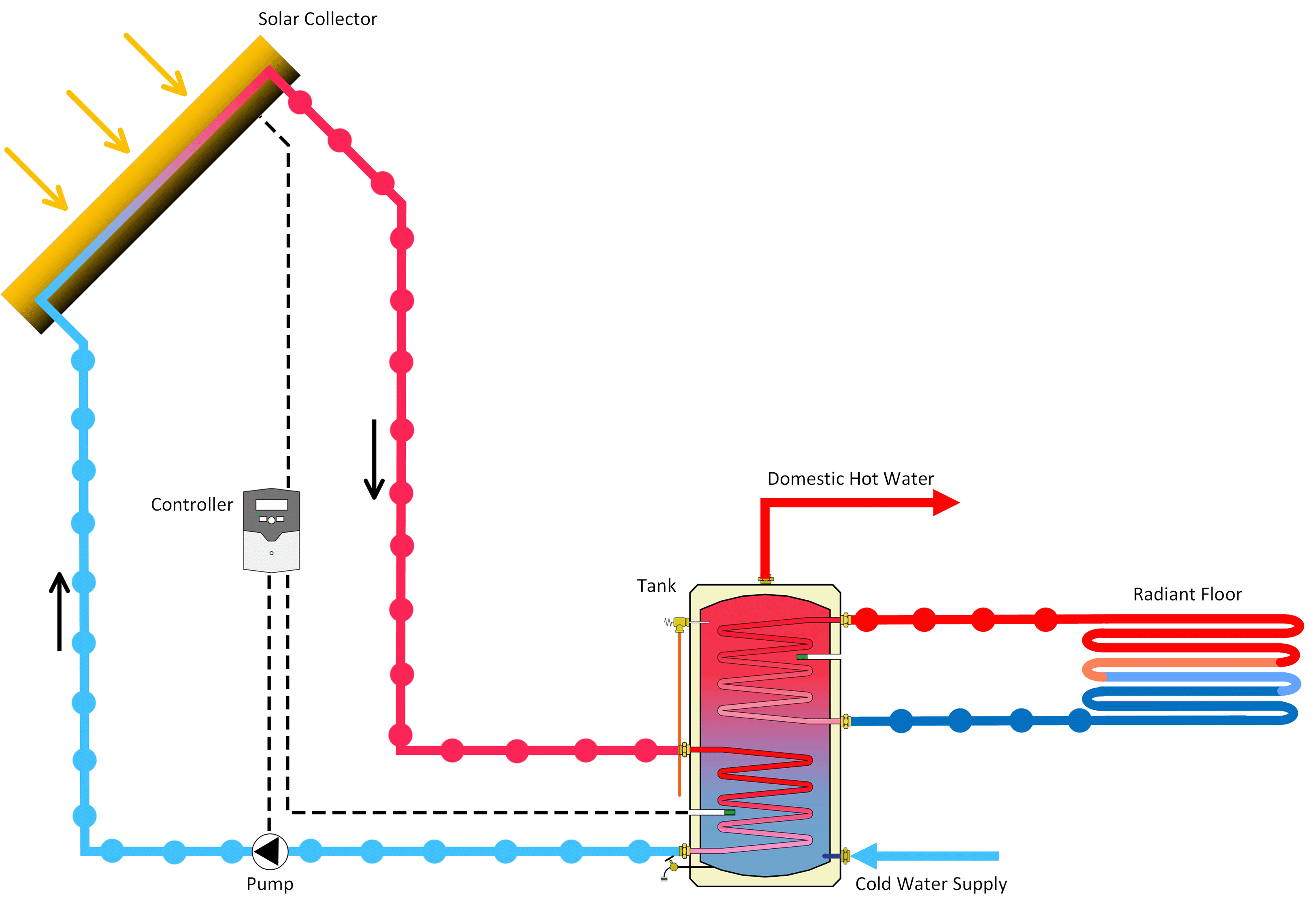 Mechanical pumps and differential controllers are used in active solar hot water systems to control and guide the flow of the heat-transfer fluid or water from the solar collector to the tank. When the water in the tank cools below the collector’s temperature, the controllers detect the temperature differential between it and the water in the tank and activate the pump. Some pumps use line power (mains electricity), while others use power produced by solar photovoltaic panels. While some solar-powered systems simply circulate the fluid when the Sun is out and store the heated water in well-insulated tanks for space heating at night, others rely on mains energy as a backup for nights and cloudy days. Since the flow of water in active solar hot water systems is not solely dependent on gravity, the water storage tanks can be placed inside the roof area or anywhere else that will reduce heat loss to the cold air. Because of this, these tanks can be integrated with hot water cylinders in household space heating systems, and the solar hot water system can be utilised to pre-heat water in the cylinder in the winter for space heating.